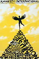 - It says at the top "Amnesty International Celebrates the 50th Anniversary of the Universal Declaration of Human Rights". It used to be available at The Amnesty International Online Store --- we no longer see it on their site but someone who doesn't want their name posted sent us this Link to Colorado State University's large picture of it. The same person also gave us a link to another page that gives detailed information about the poster including that the artist is Woody Pirtle and that it came out in 1998 and its dimensions are 91 x 61 cm. See this information page with another large version of the poster.